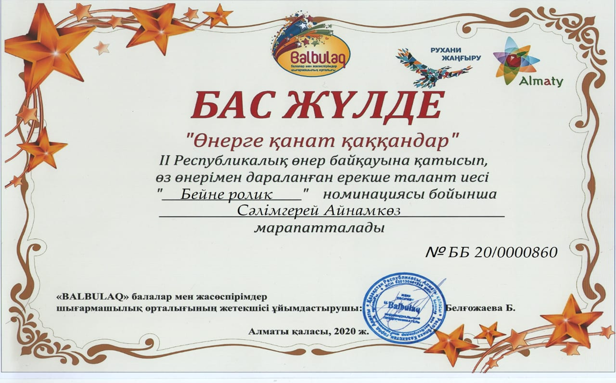 “Өнерге қанат қаққандар”II Республикалық өнер байқауына қатысып,өз өнерімен дараланған ерекше талант иесі “ Бейне ролик” номинациясы бойынша Сәлімгерей Айнамкөз Марапатталады.