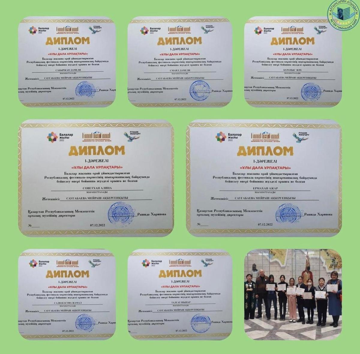 бейнелеу өнері бойыиша жүлделі 1 орынға ие болған үшін Ы.Алтынсарин атындағы №159 гимназия оқушылары марапатталады.