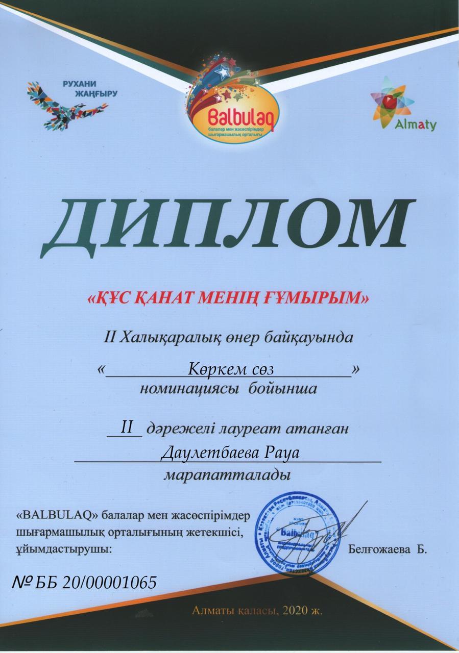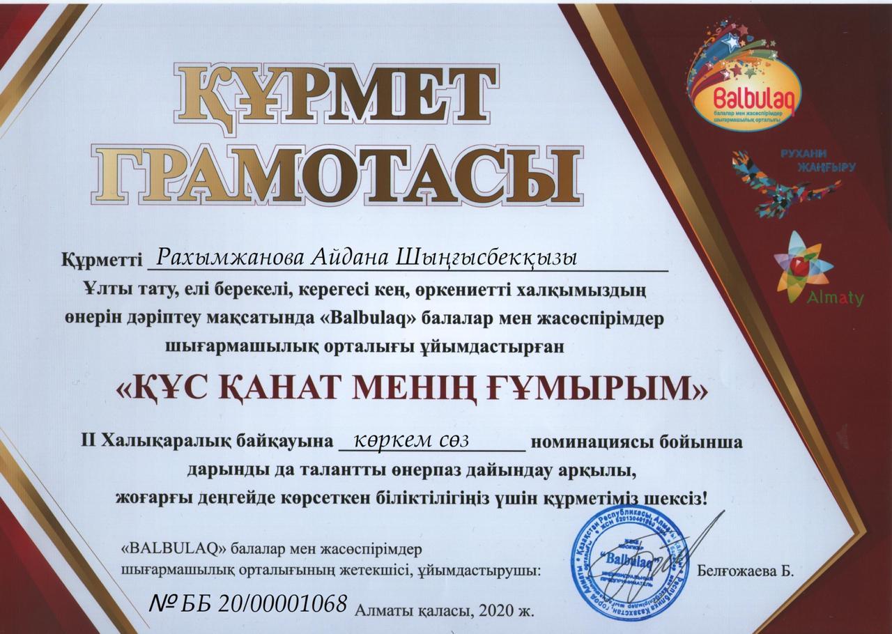“Өнерге қанат қаққандар” II Республикалық өнер байқауына қатысып,өз өнерімен дараланған ерекше талант иесі “ Бейне ролик” номинациясы бойынша Сәлімгер