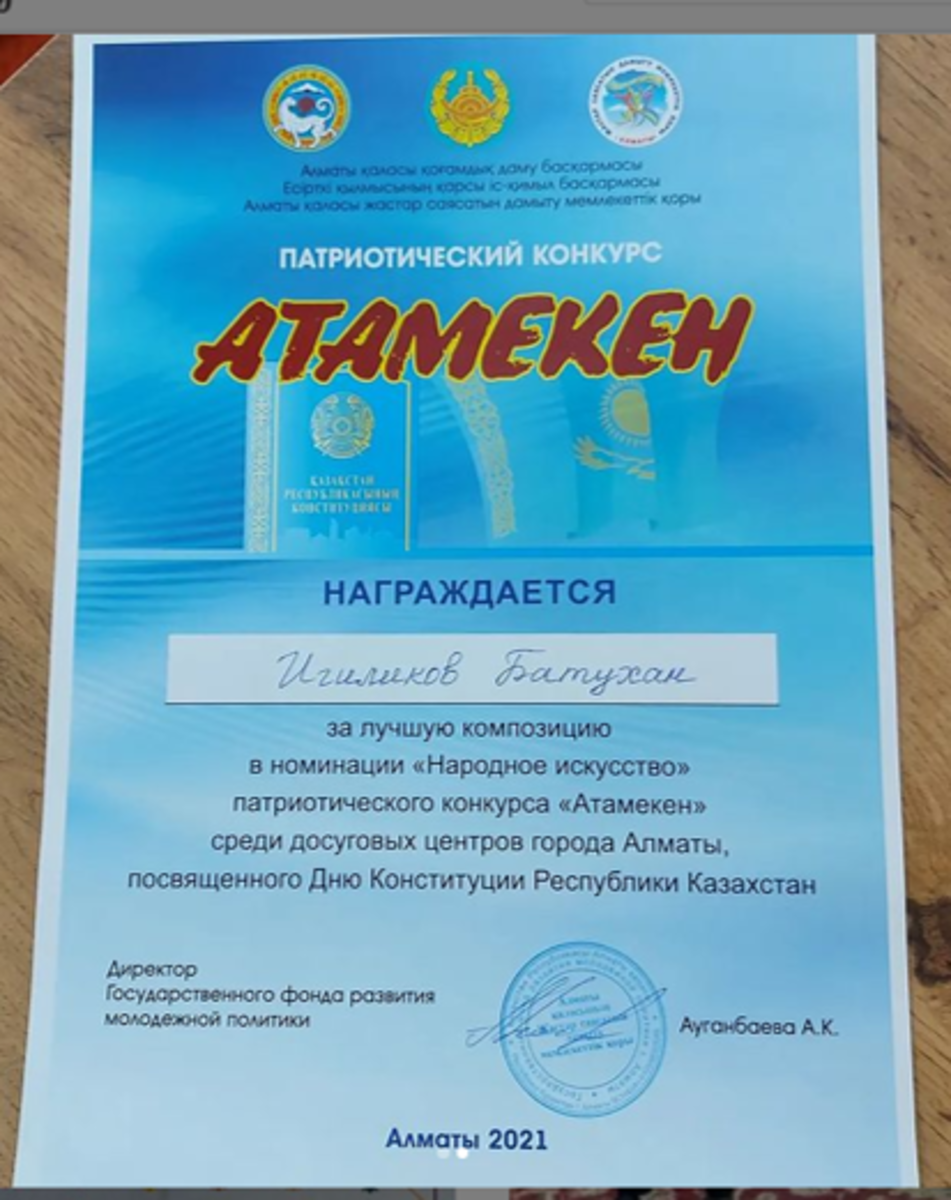 Қазақстан Республикасының Конституциясы күніне орай ұйымдастырылған Патриоттық "Атамекен" конкурсына қатысып, үздік компазиция көрсеткен 9 "Ә" сынып оқушысы, Республикалық өнер байқауларының жеңімпазы Игиликов Батуханды құттықтаймыз. Өнерің өрге жүзсін🏆