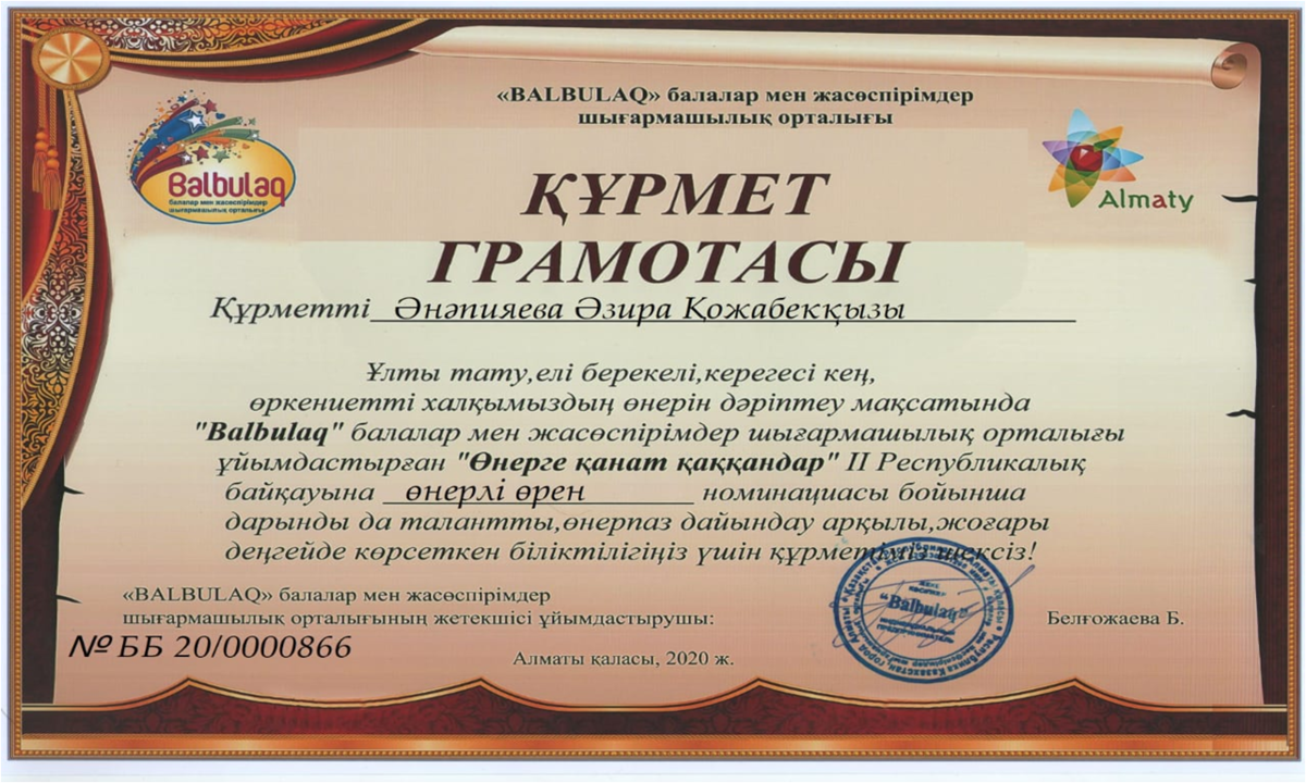 «Өнерге қанат қаққандар»II Республикалық байқауына Өнерлі өрен номинациясы бойынша талантты өнерпаз дайындағаны үшін ӘнәпияеваӘзираҚожабекқызыҚұрметграмотасымен марапатталды.