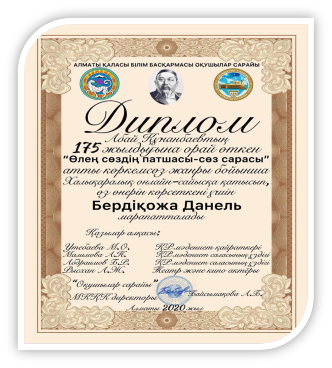 Абай Құнанбаевтың 175 жылдығына орай өткен “Өлең сөздің патшасы – сөз сарасы”атты Халықаралық байқауына шәкірт тәрбиелегені үшін алғыс хатпен Жиенбаева Жанат Бола тқызы марапатталды.