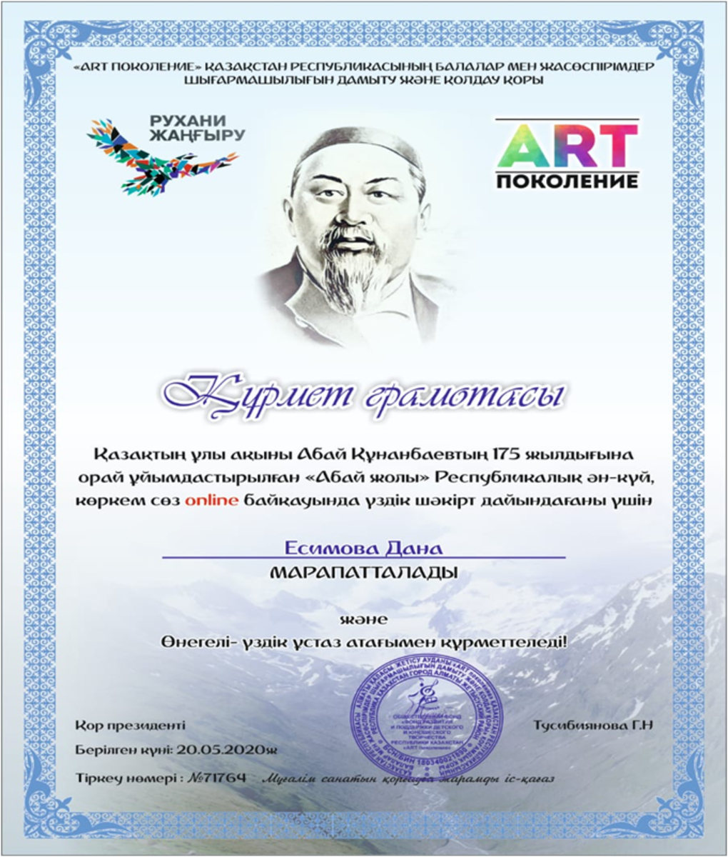 Абай Құнанбаевтың 175 жылдығына орай ұйымдастырылған “Абай жолы”Республикалық ән – күй ,көркем сөз online байқауында үздікшәкірт дайындағаны үшін Есимова Дана марапатталды.